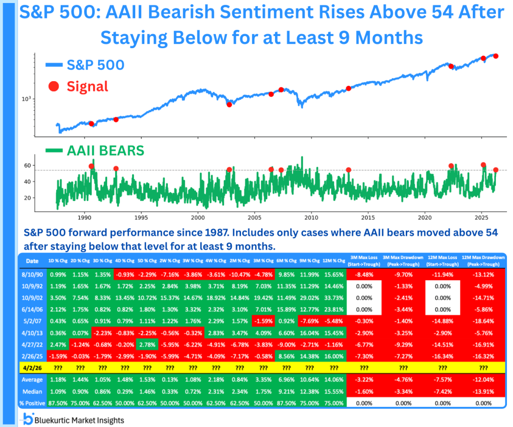 Market sentiment is at its most bearish level in 9+ months. AAII bears just hit 54 for first time since May 2025. Sentiment isn’t a timing tool, but it can act as a contrarian signal for medium to long term investors. Six months later, S&P 500 $SPX was positive 7 of 8 times.
