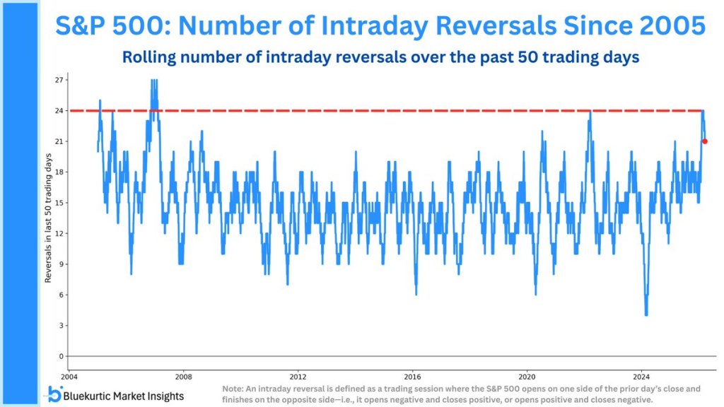 Similar whipsaws were last seen only during the 2022 bear market and ahead of the 2008 financial crisis.