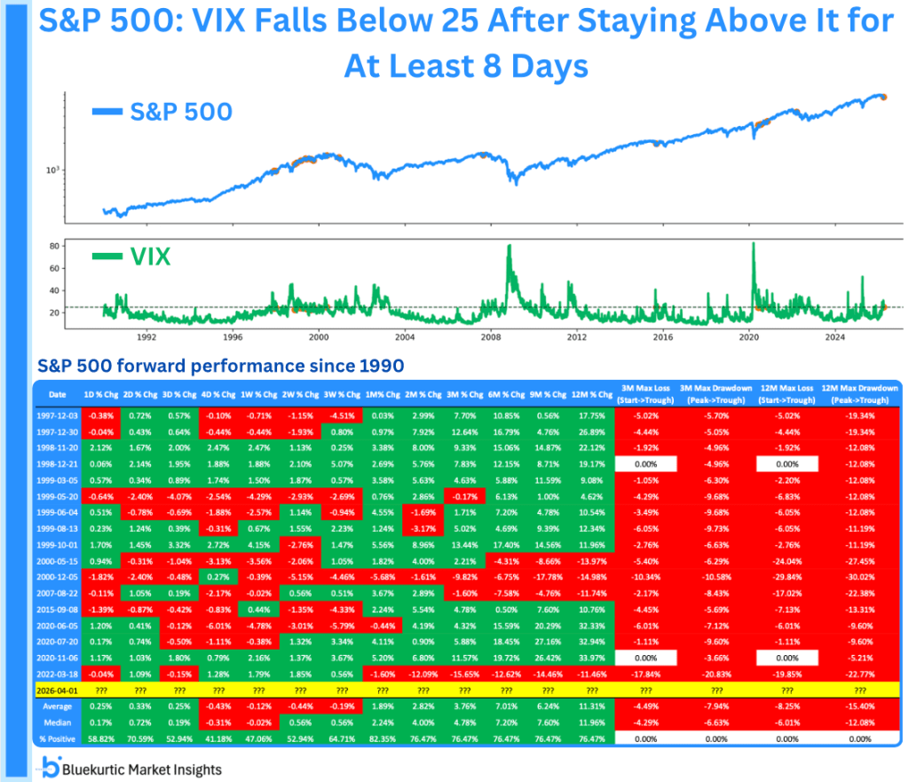 $VIX just closed below 25 after staying above that level for 8 straight days. This level still signals elevated volatility and near term swings in $SPX can remain choppy. But historically, 1 month later, $SPX was higher 14 out of 17 cases, with a median gain of 2.2%.